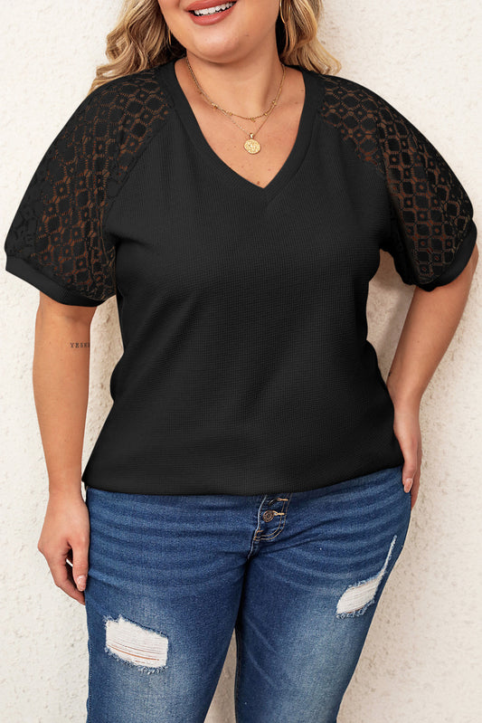 Apricot Mesh Sleeve V Neck Plus Size T Shirt -