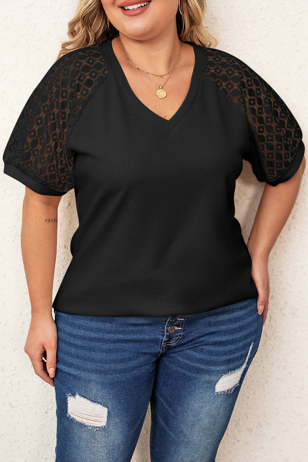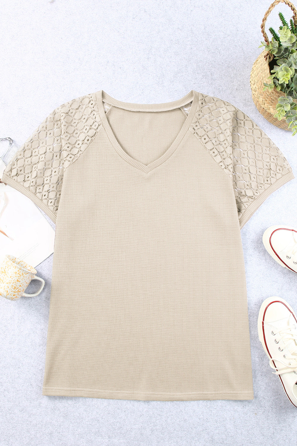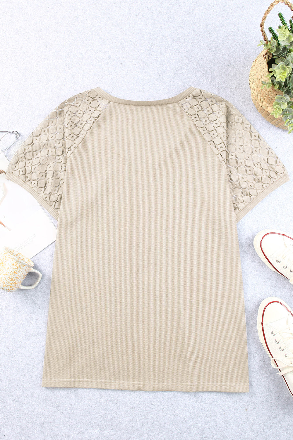 Apricot Mesh Sleeve V Neck Plus Size T Shirt