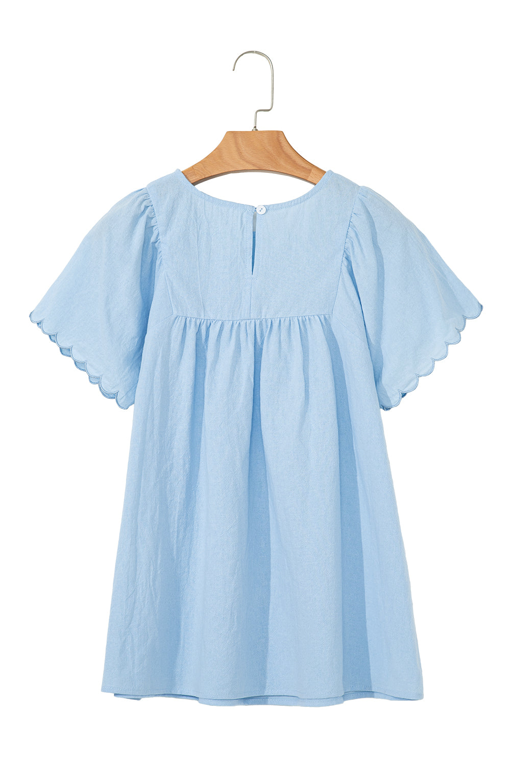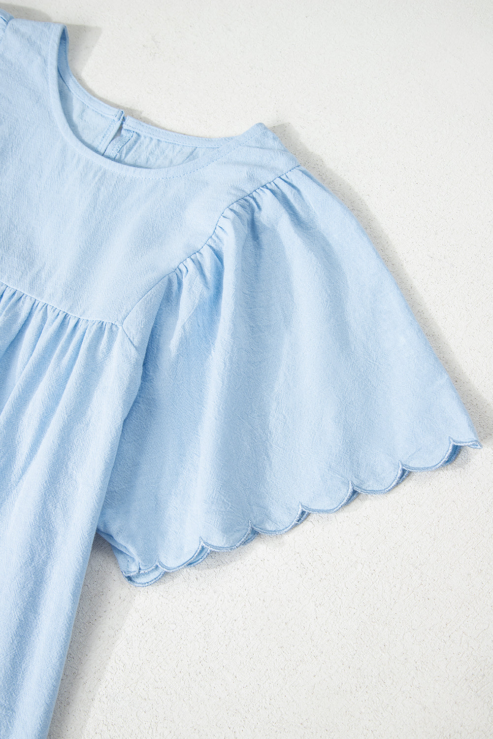 Beau Blue Embroidered Scallop Trim Sleeve Pleated Blouse
