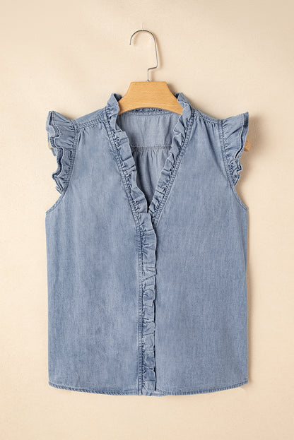 Beau Blue Ruffle V Neck Chambray Sleeveless Shirt
