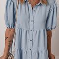 Beau Blue Shirt Collar Button Up Short Puff Sleeve Tiered Shift Dress