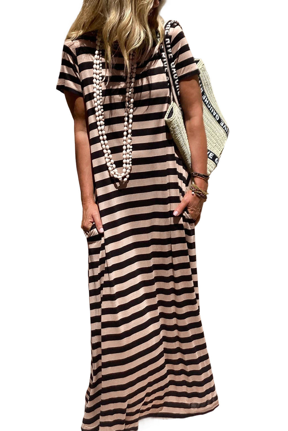 - Embrace a laid-back vibe with the classic black and white stripes that never go out of style, making this dress a versatile piece for various occasions.