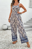 Blue Boho Geometric Print Smocked High Waist Wide Leg Jumpsuit