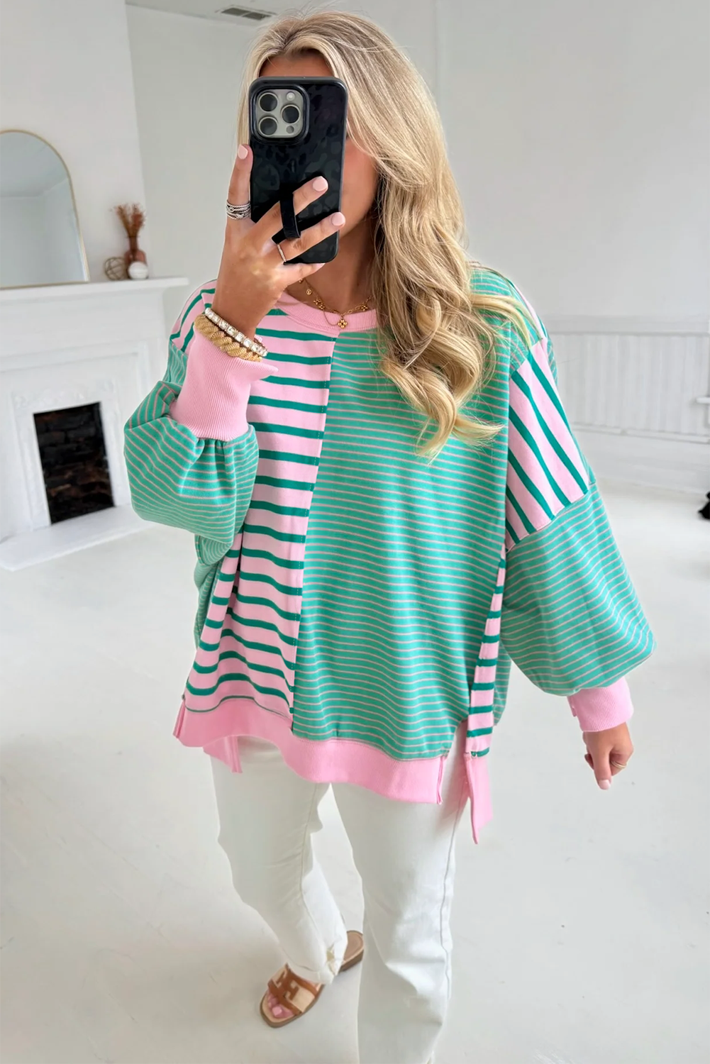 Green Stripe Colorblock Patchwork Side Split Sweatshirt