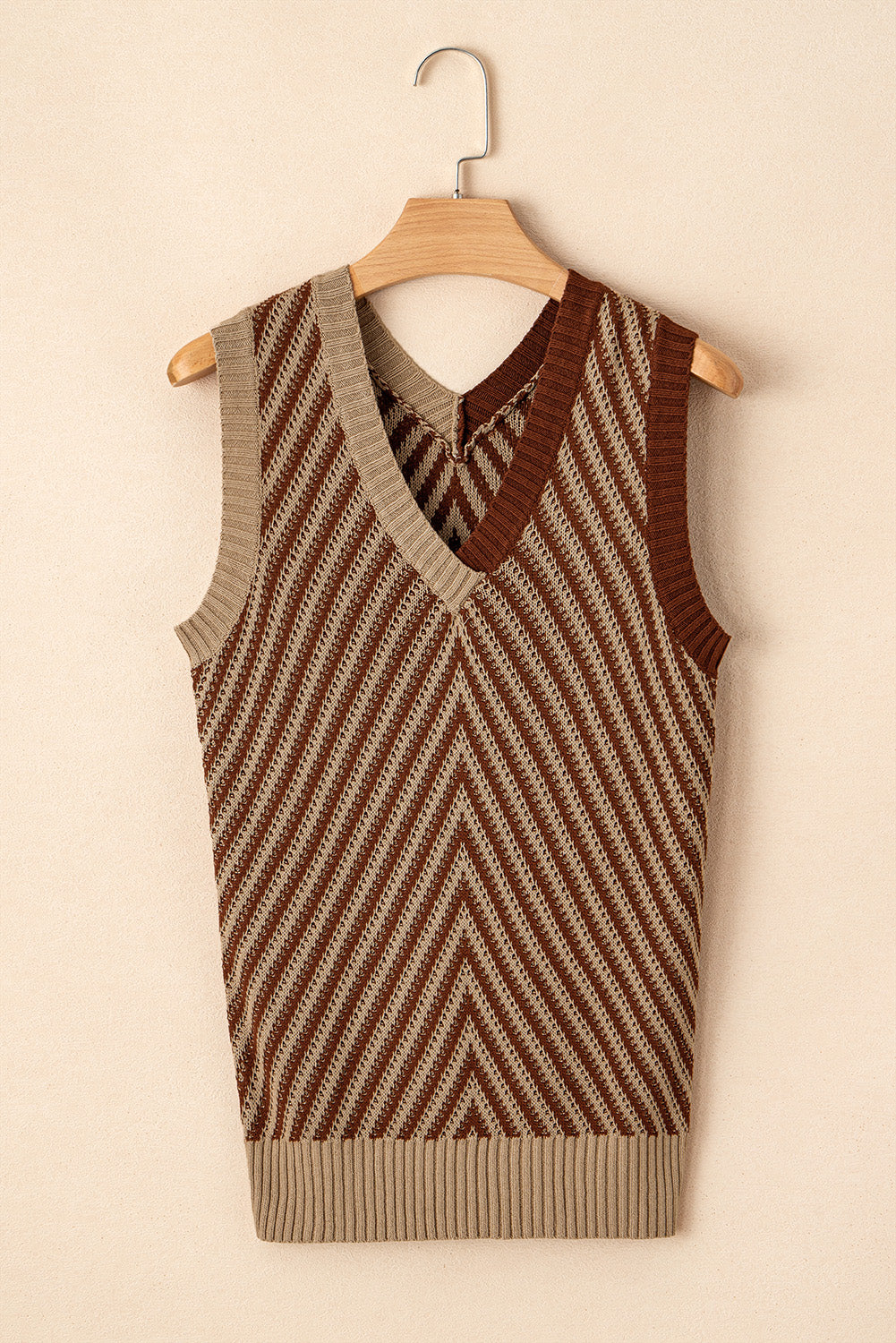 Light French Beige Contrast Chevron V Neck Knitted Vest