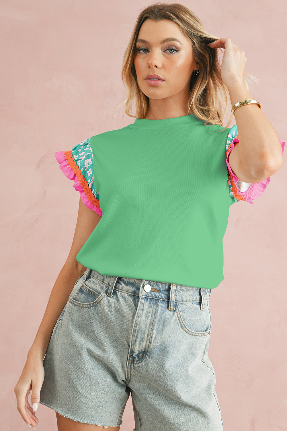Light Green Ricrac Applique Floral Sleeve Textured Blouse