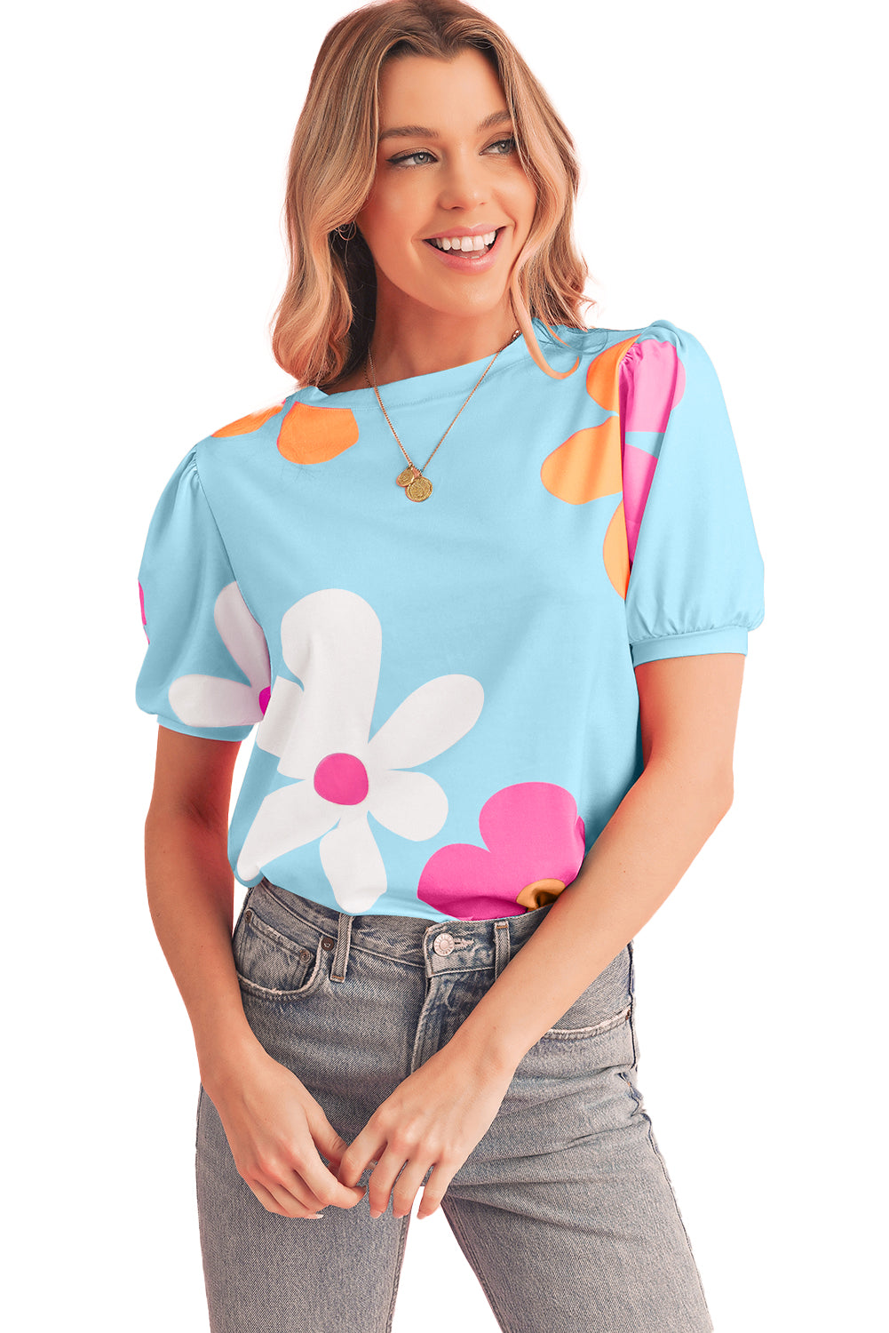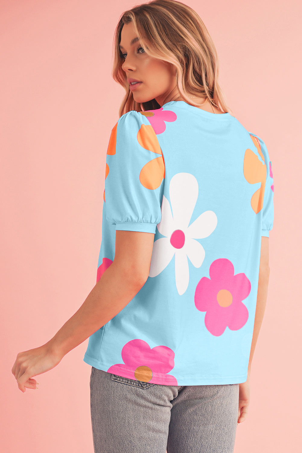- The tee is a vibrant and stylish top featuring a lively floral print and trendy bubble sleeves.