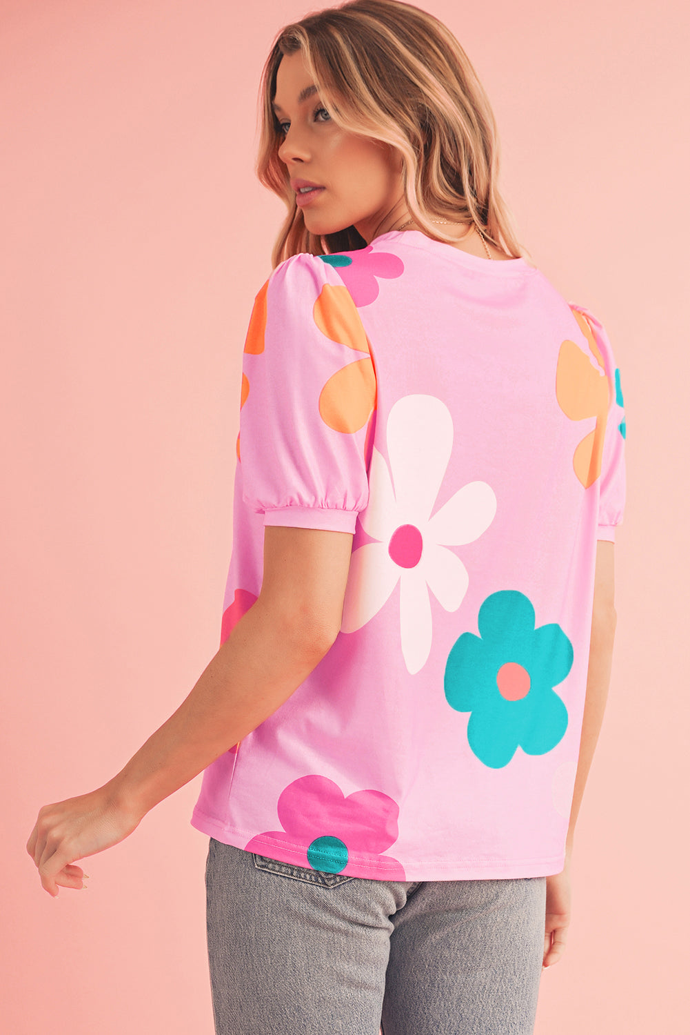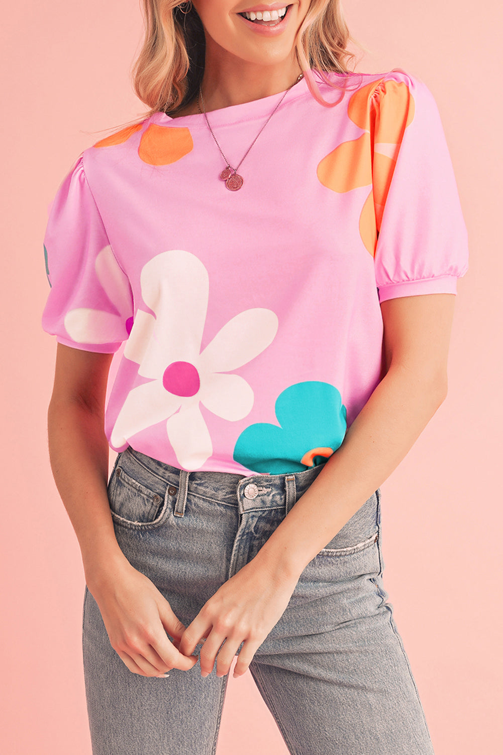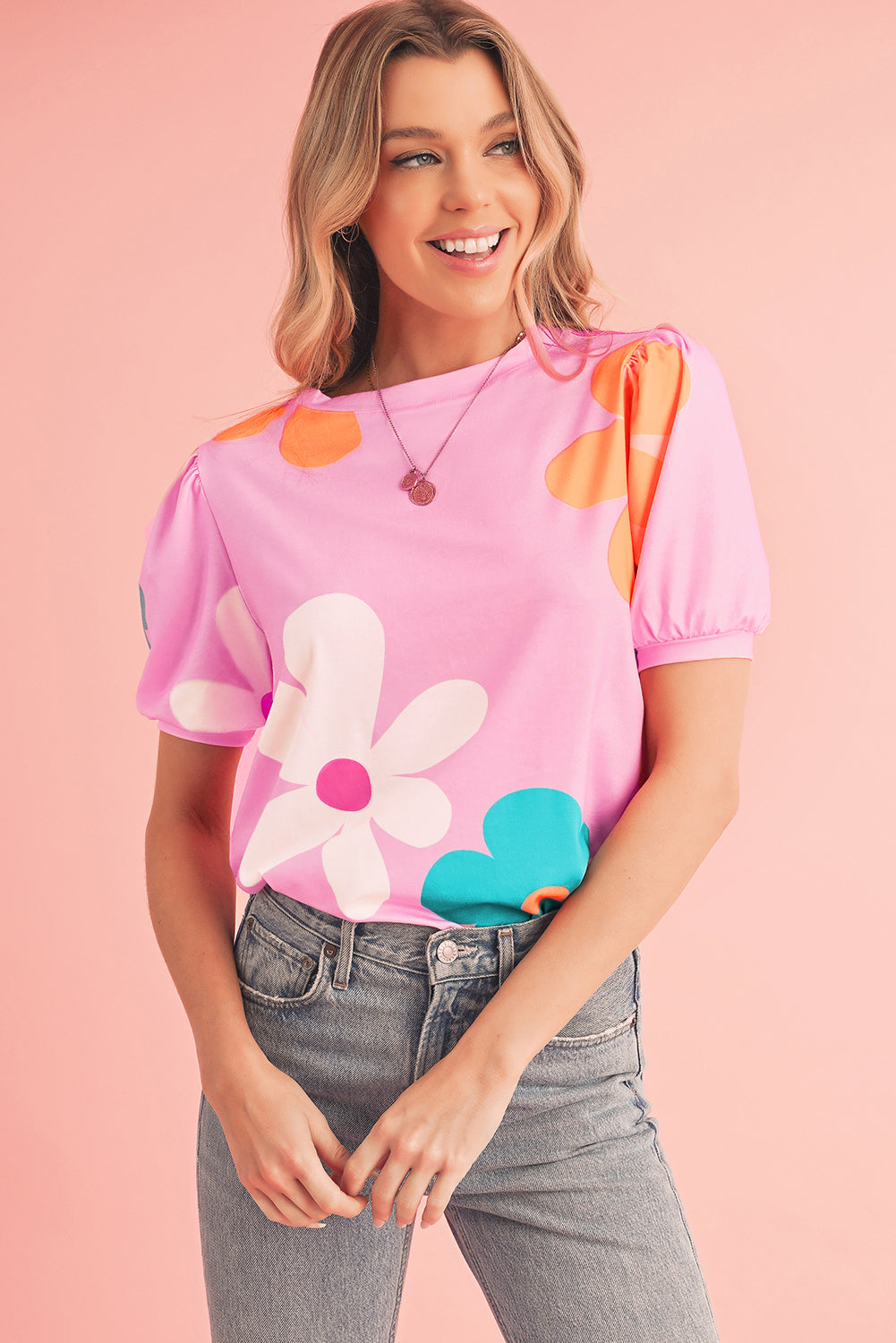 Pink Colorful Flower Print Bubble Sleeve Tee
