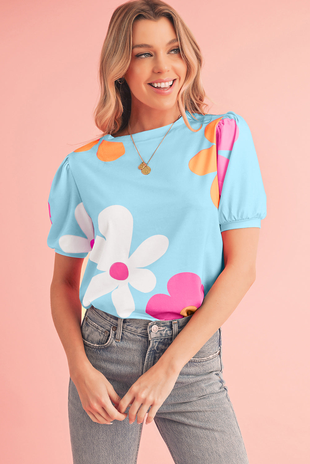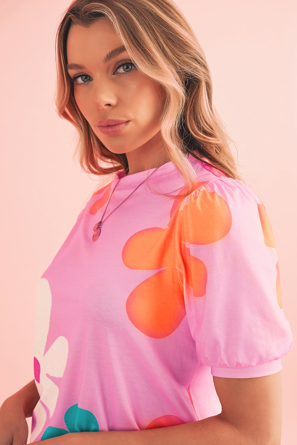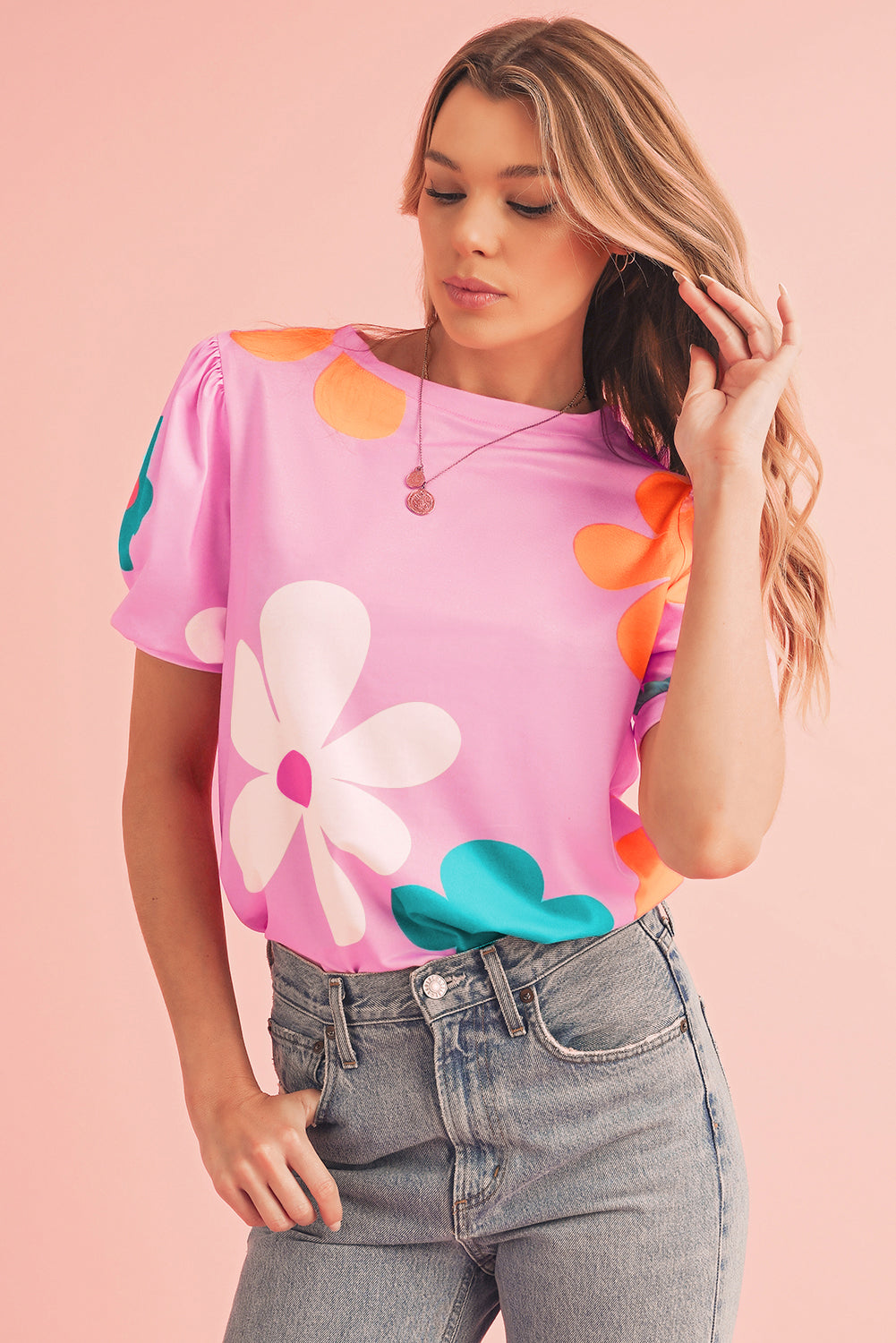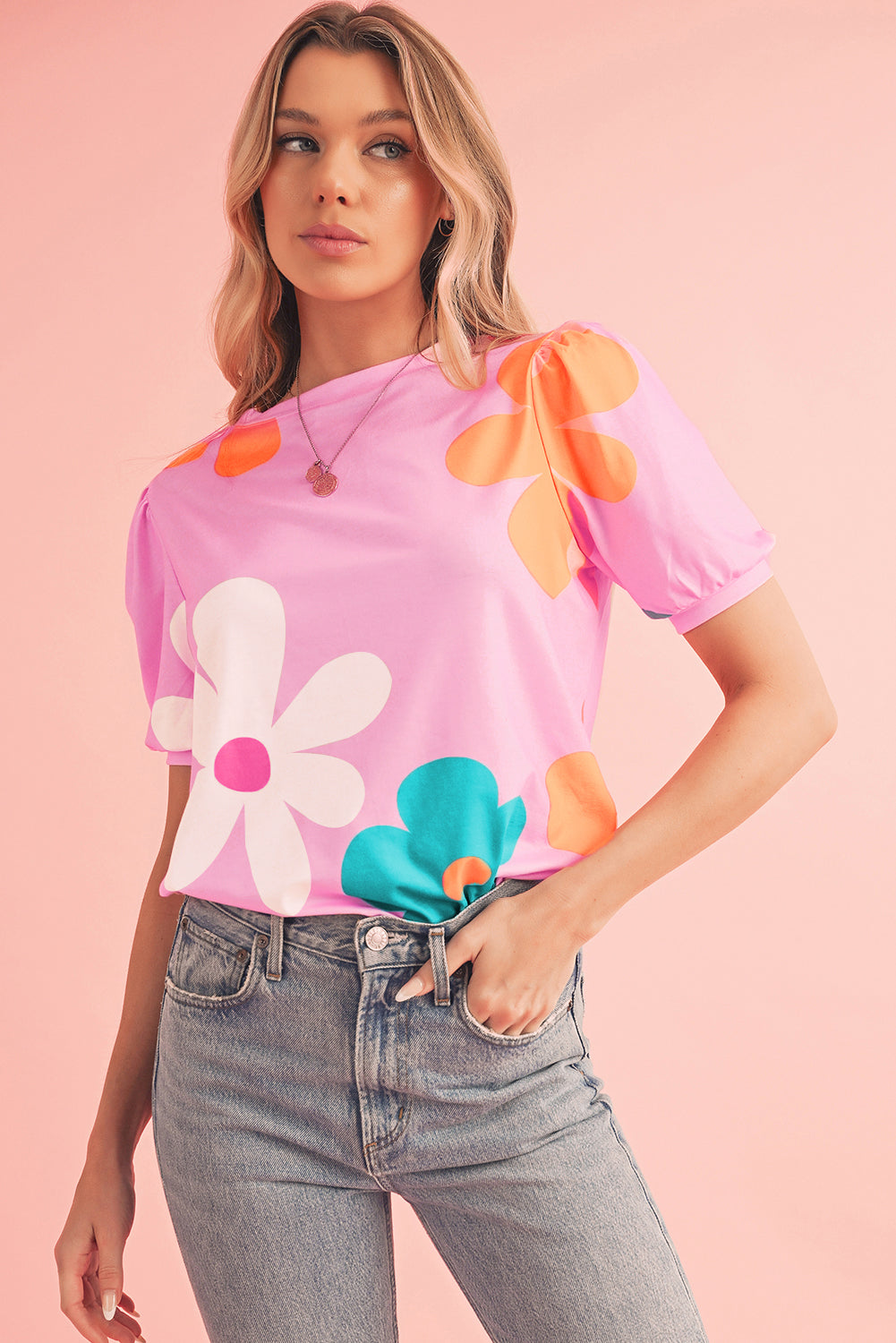 Pink Colorful Flower Print Bubble Sleeve Tee