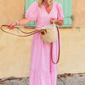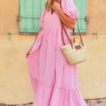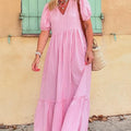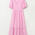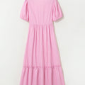 Pink Striped V Neck Puff Sleeve Frill Tiered Maxi Dress
