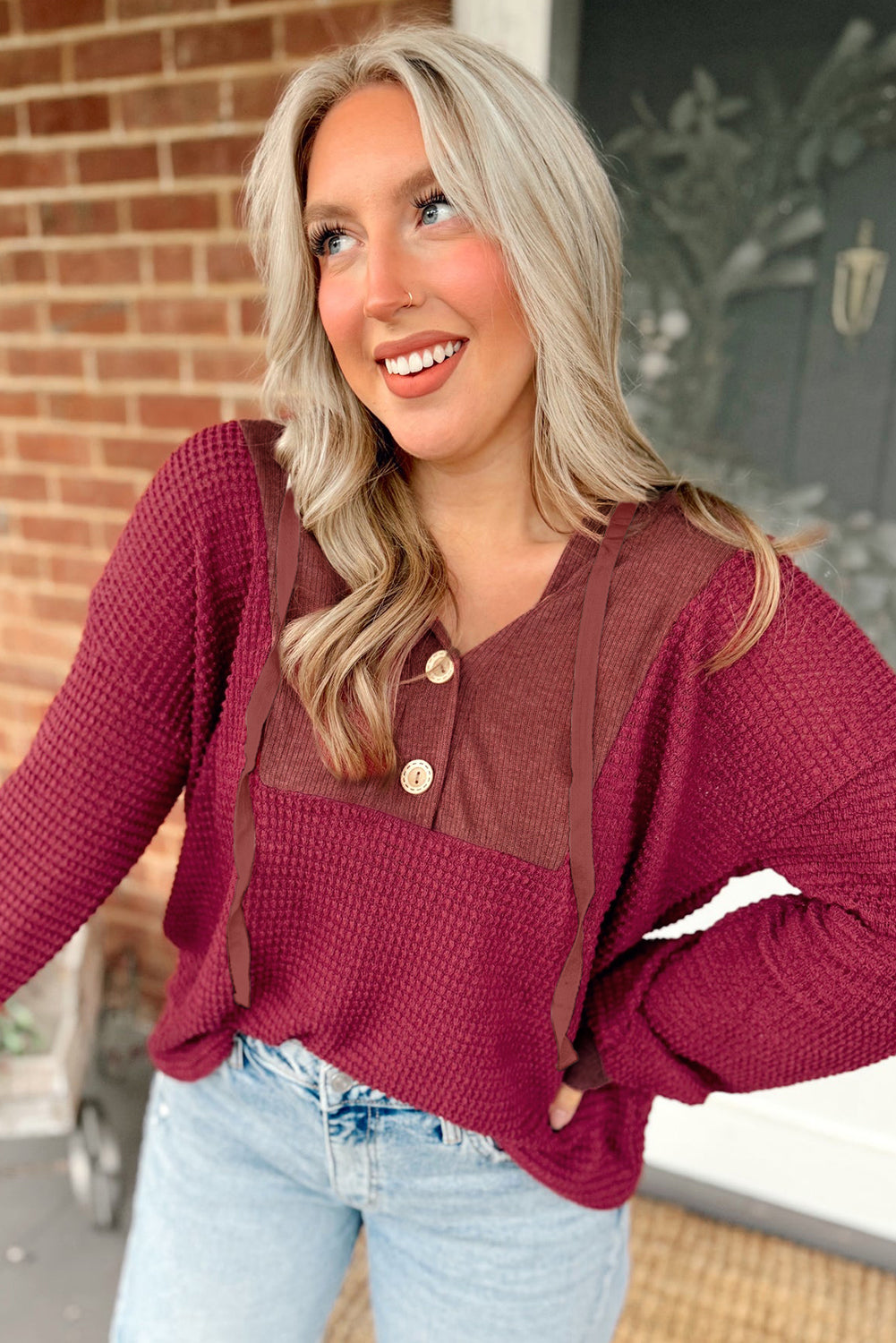 - Crafted from cozy waffle fabric, this top offers both comfort and warmth, making it an ideal choice for chilly days or casual outings.