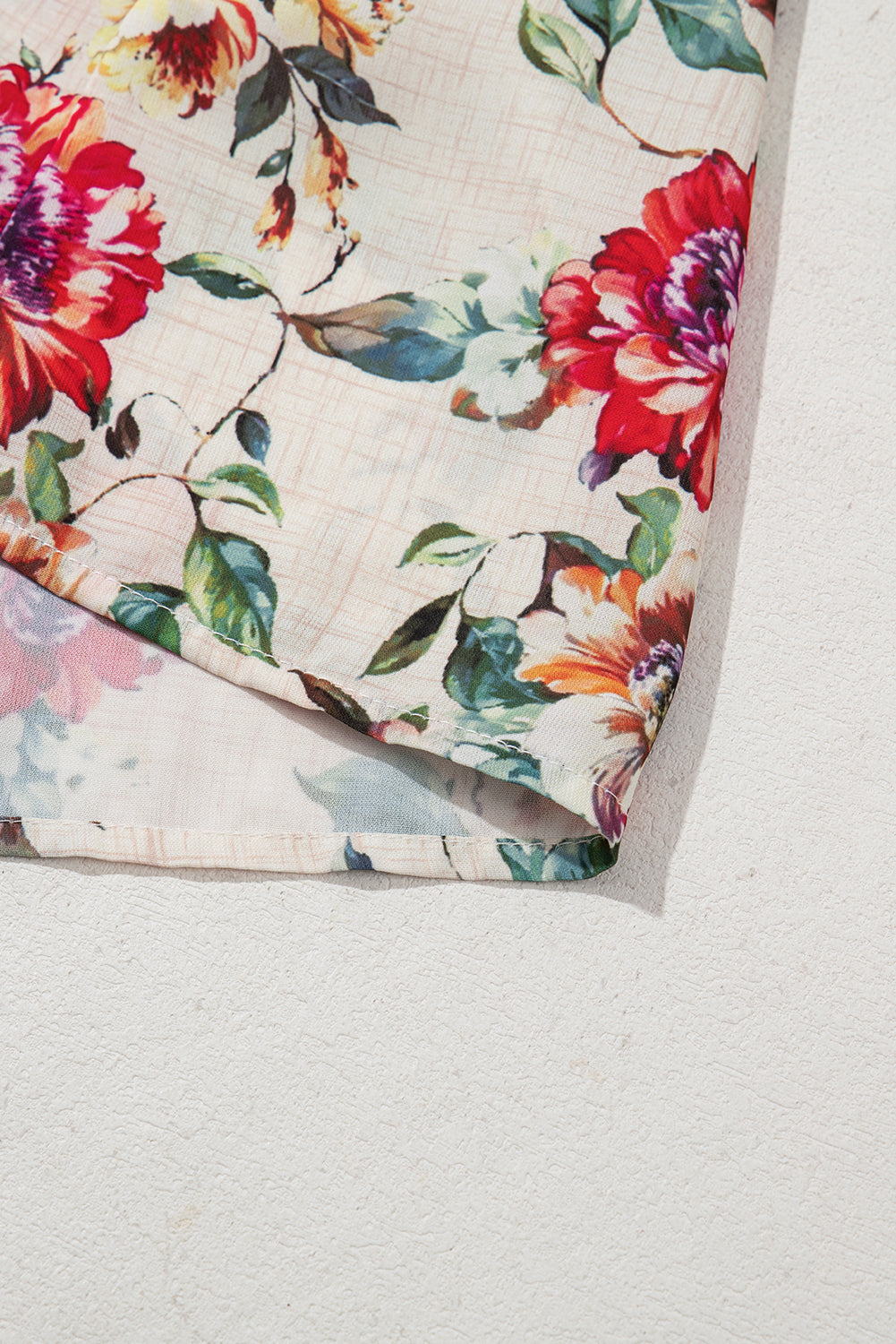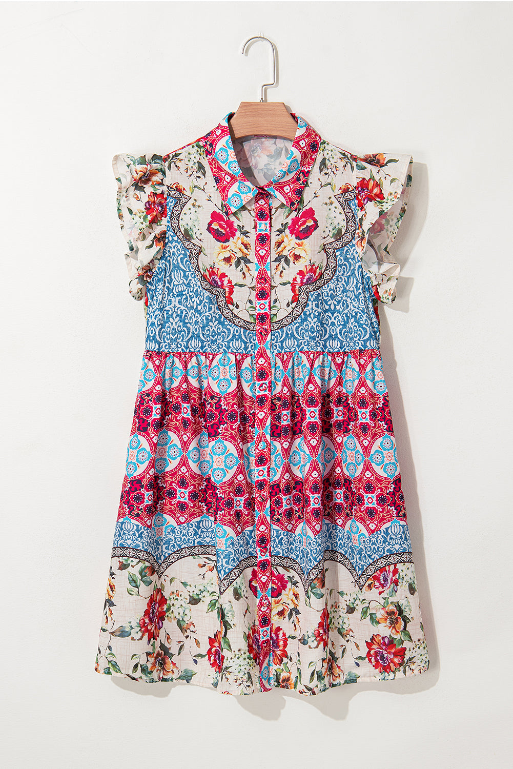 - Exude bohemian elegance in this mini dress, featuring vibrant florals and charming ruffle details.