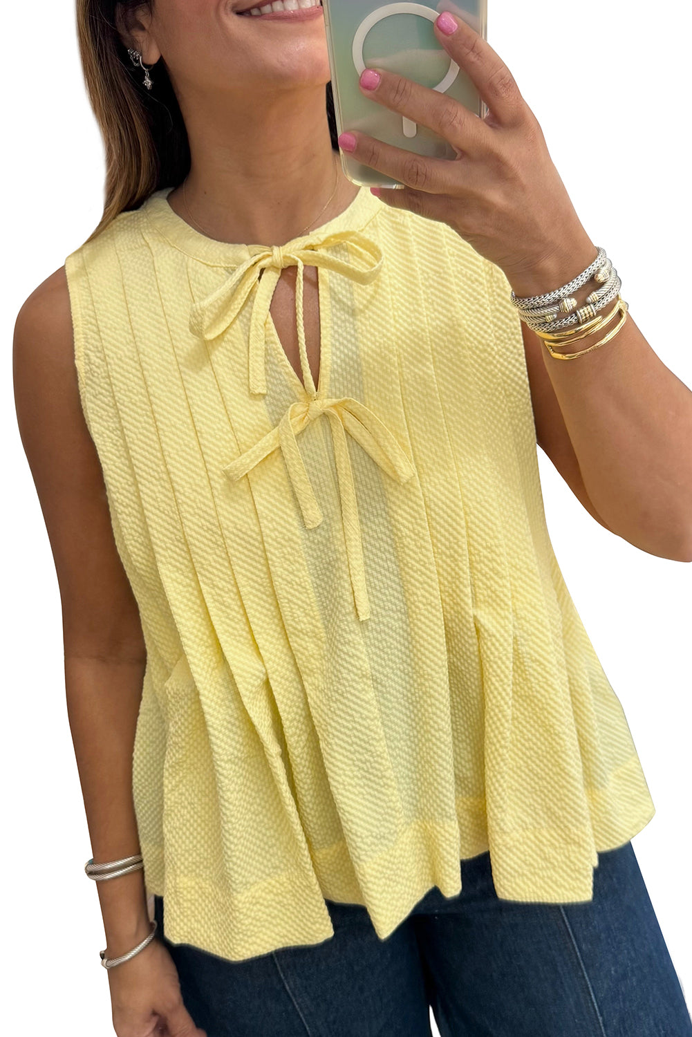 Yellow Cream Bow Tie Notched Neck Pleated Sleeveless Top